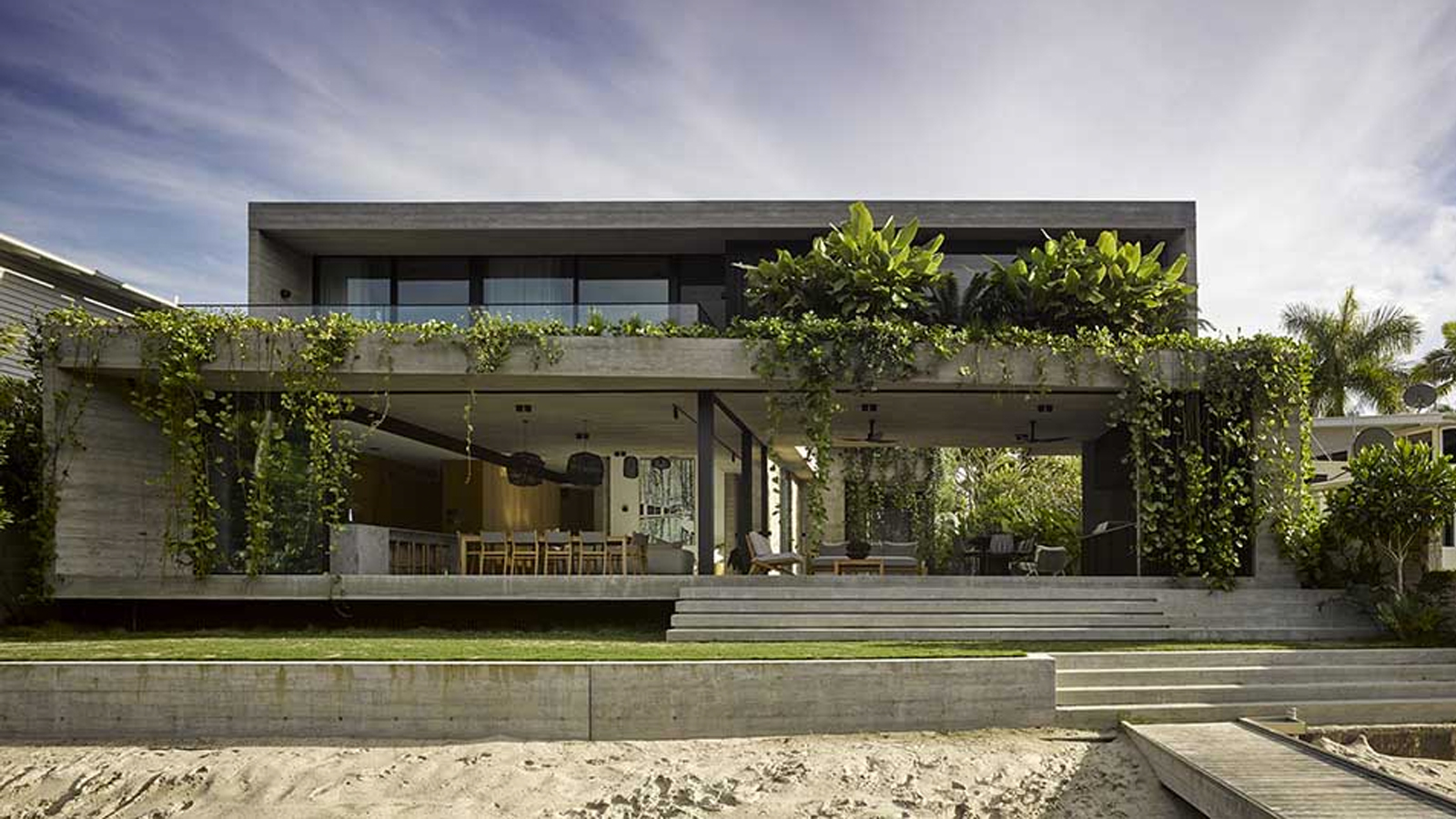 The double-story house, located in Noosa Heads in Queensland, has a unique architectural design and is made with concrete and timber, giving the house a modern and clean look. However, draped beautifully over the exterior are lush plants and greenery, which softens the angular lines of the house and, ultimately, gives the property cool ‘urban meets jungle’ vibes.