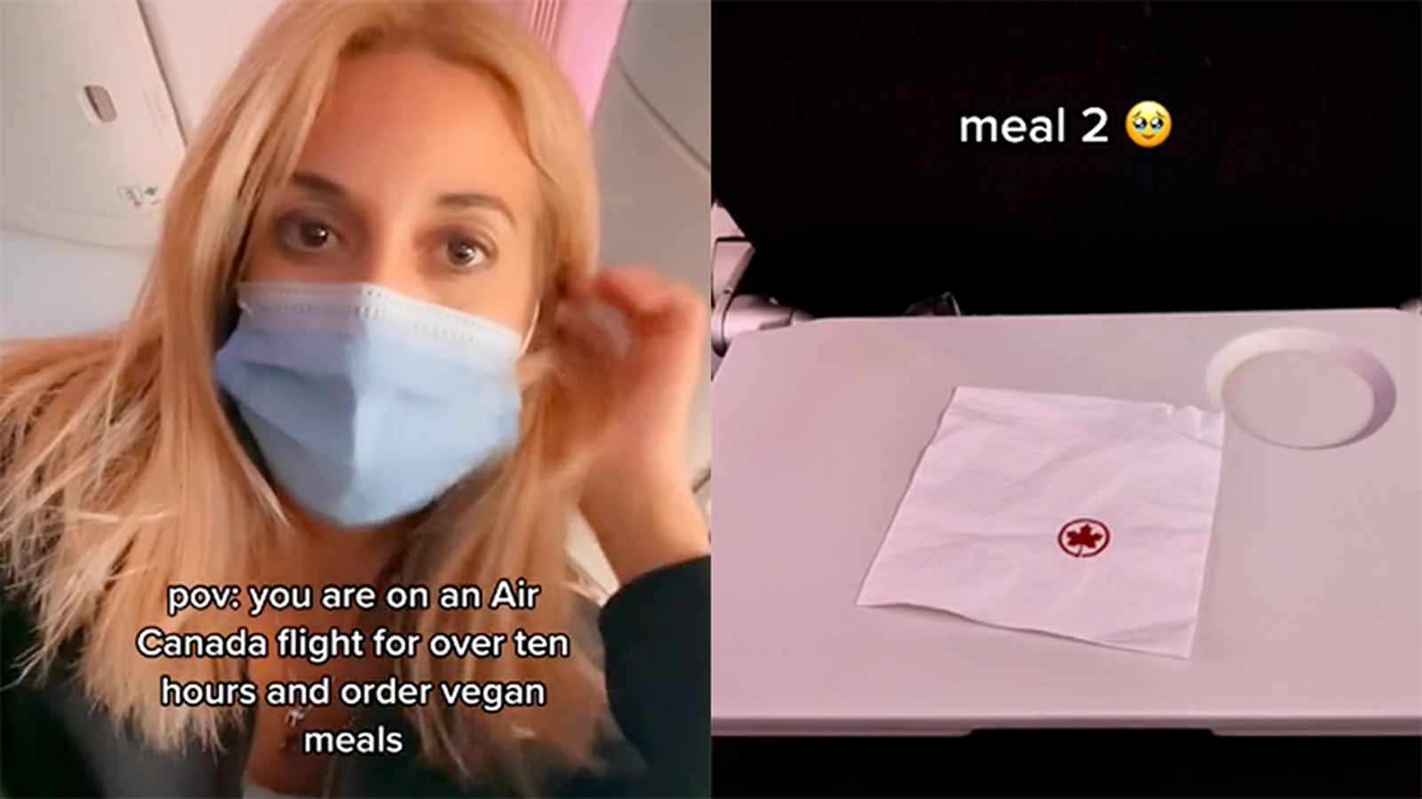 A vegan passenger has taken to TikTok to share the dismal meal service she received on a recent 10-hour Air Canada flight. She claims meal one was a bottle of water, and meal two was a napkin. Her story inspired others to share their stories of the grim meals they have received after selecting a vegan menu option on a flight.